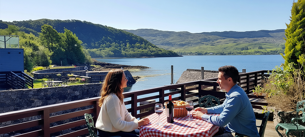 Comfortable Lounge & Balcony - The lounge features two comfy settees and an arm chair with a wood burner fire in the corner and flatscreen smart tv opposite the settees where you can log into all your favourite streaming apps. French windows lead onto a balcony with beautiful views over Loch Melfort. A table and chairs is tucked into a curved sitting area and garden to the left where you can sit and enjoy some refreshments.
