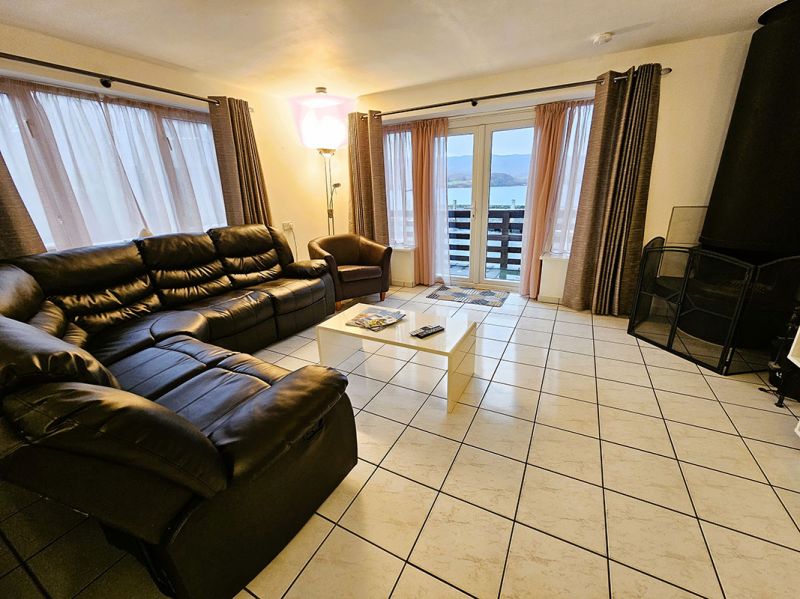 Comfortable Lounge & Balcony - The lounge features two comfy settees and an arm chair with a wood burner fire in the corner and flatscreen smart tv opposite the settees where you can log into all your favourite streaming apps. French windows lead onto a balcony with beautiful views over Loch Melfort. A table and chairs is tucked into a curved sitting area and garden to the left where you can sit and enjoy some refreshments.