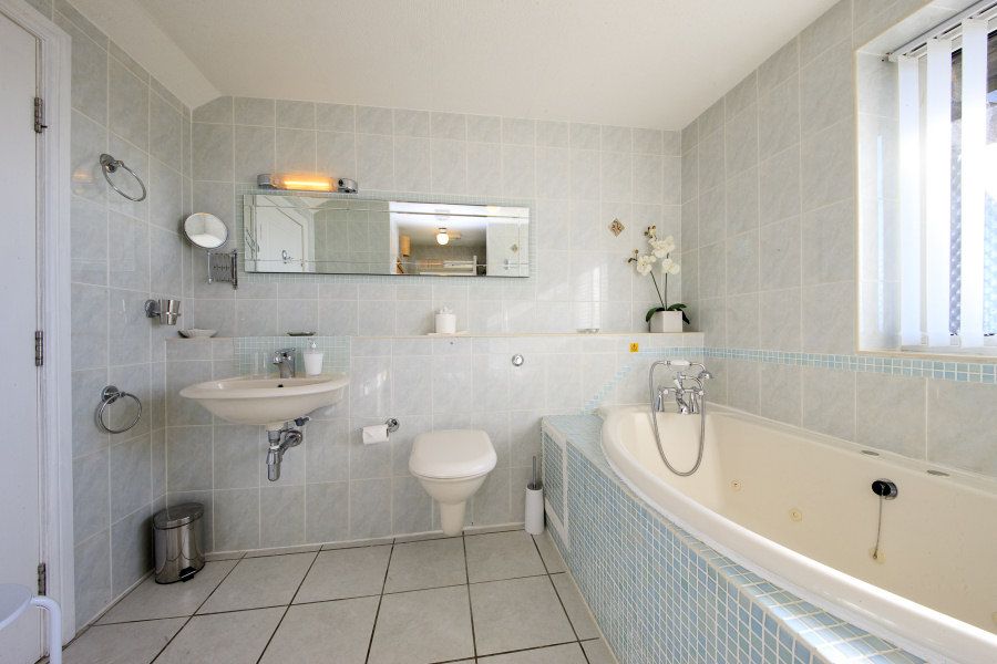 Bathroom 1 - Shower, spa bath, basin and W.C., electric towel heater and toilet paper