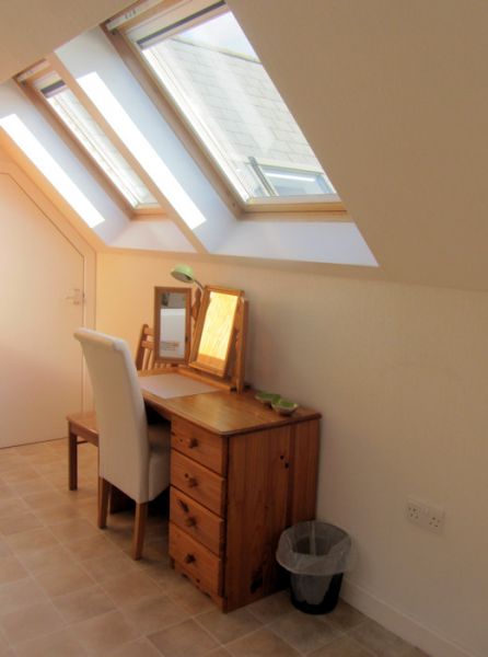 The bedroom has a long super king size bed .Flat screen TV, dressing table, cupboard, sofa .